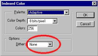 menu will pop up. Make sure the Palette is set to "Adaptive", this makes Photoshop choose a set of 256 colors to best represent your image, so if your image is predominately red, then it will choose a nice set of red colors based on your image. (In PaintShop Pro, this is under "Decrease color depth - 256 colors". Make sure the Palette is set to optimised) |